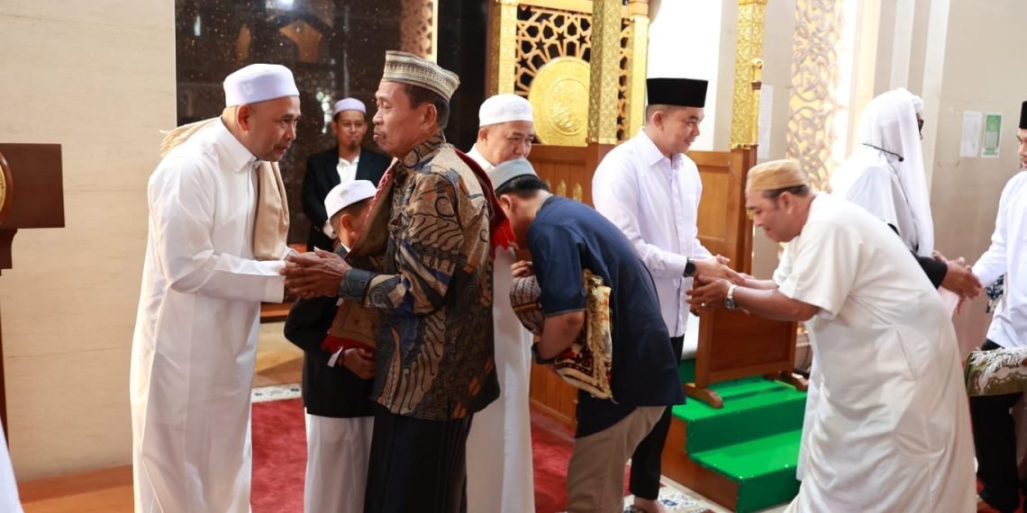 , Tanah Bumbu – Kemeriahan Idul Fitri di Tanah Bumbu terasa begitu kental dengan nuansa haru dan kebersamaan. Pada Senin (31/3/2025), Masjid Agung Al-Falah, Kecamatan Simpang Empat, menjadi saksi ribuan warga yang datang bersama Bupati Andi Rudi Latif (Bang Arul) untuk melaksanakan Salat Idul Fitri 1446 Hijriah. Sejak subuh, halaman masjid sudah dipenuhi oleh masyarakat yang berbondong-bondong bersama keluarga untuk menyambut hari kemenangan dengan penuh suka cita.
