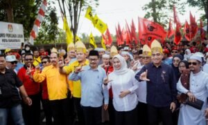 Kabarjujur.com BANJARBARU – Ribuan massa mengiringi pendaftaran Hj. Erna Lisa Halaby dan Wartono sebagai calon Wali Kota dan Wakil Wali Kota Banjarbaru ke KPU, Kamis