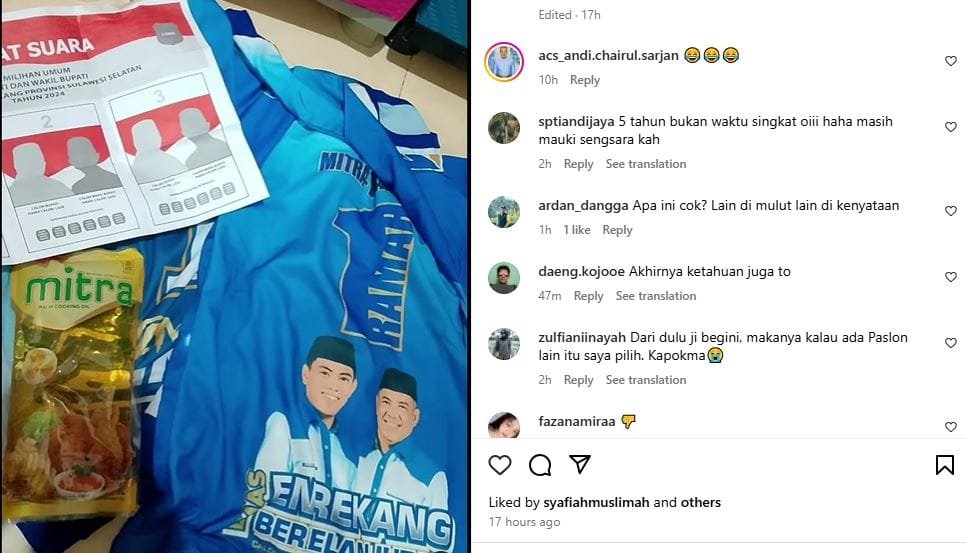 “Dari dulu ji begini, makanya kalau ada Paslon lain itu saya pilih. Kapokma,” timpal akun @zulfiiinah.